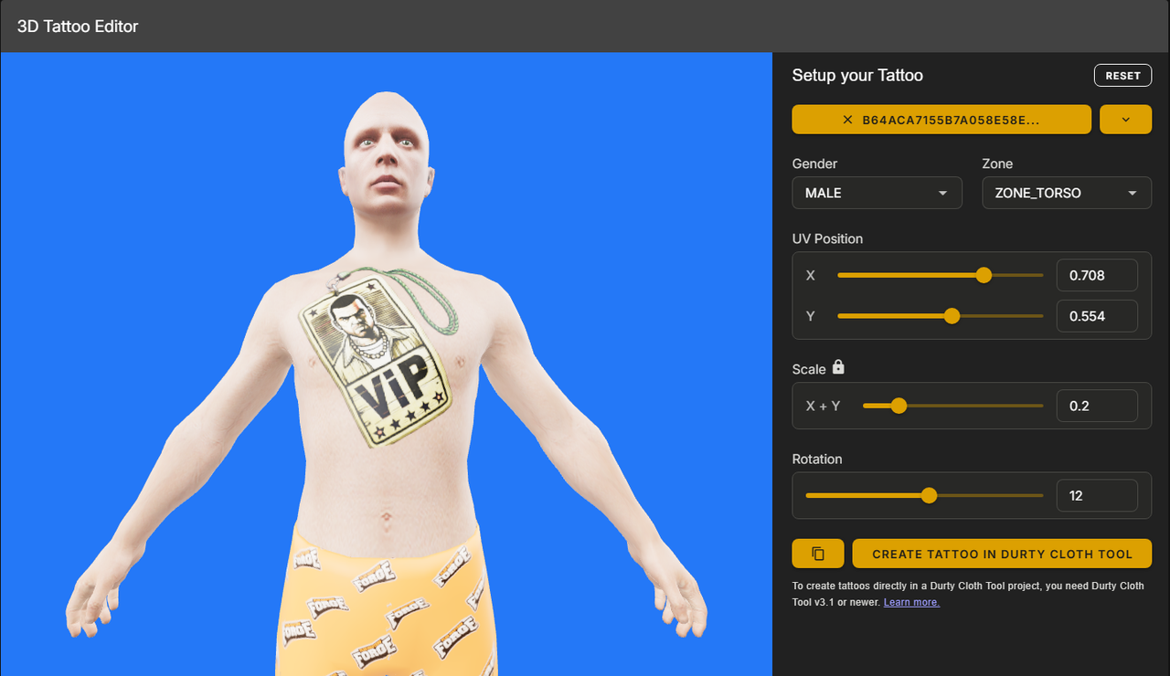 - A screenshot from the Tattoo Tool showing the final placement and values